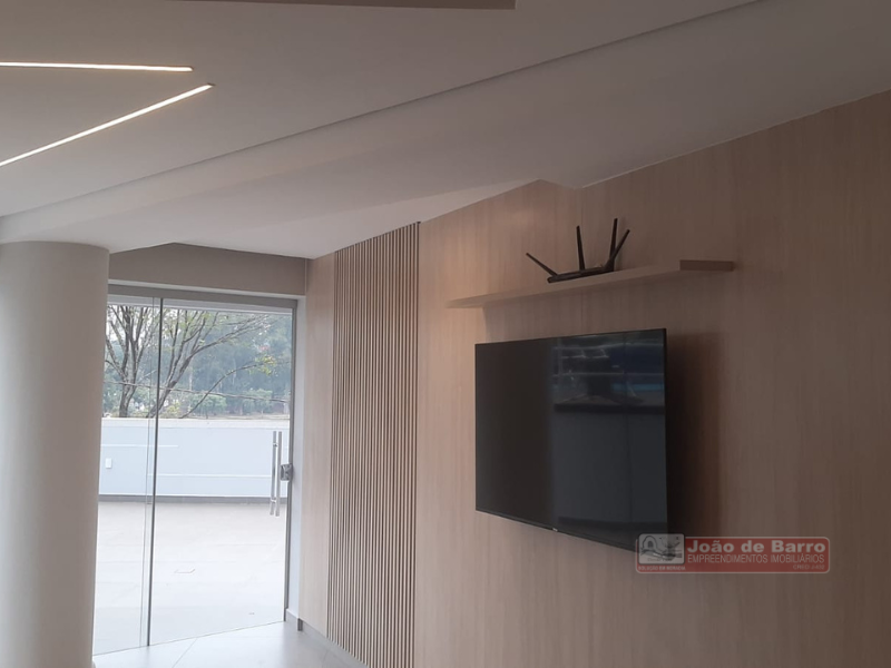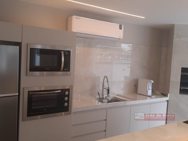 01 dormitório sendo suíte com armários embutidos – ar condicionado – cama com colchão de casal – banheiro com box de vidro temperado – sala de estar com sofá – rack – tv Toshiba 43 polegadas – mesa c/ cadeiras – persianas – cozinha c/ armários planejados – geladeira – fogão – exaustor – micro-ondas – área de serviço c/ armários.